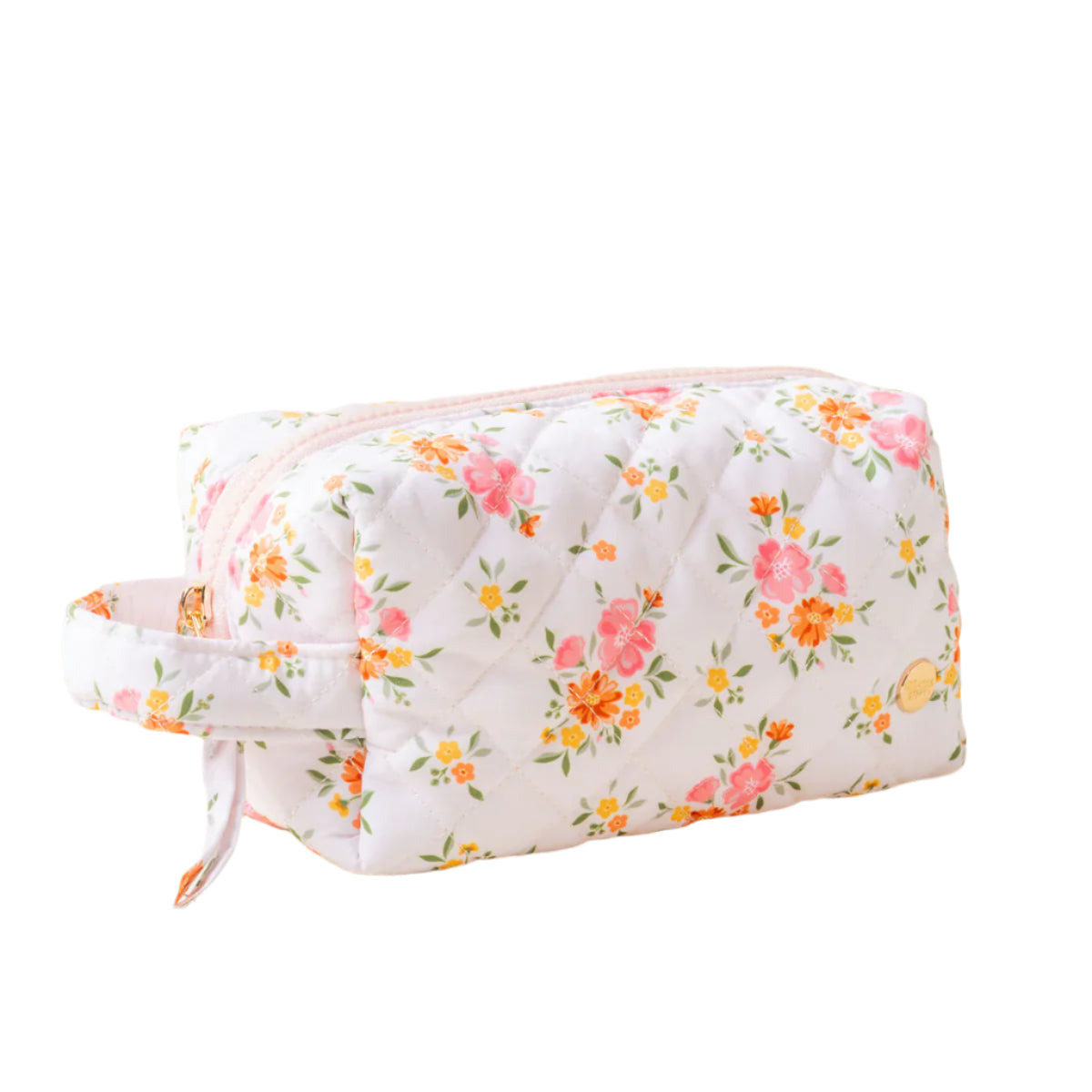 Keep your essentials organized with the Essentials Quilted Cosmetic Pouch! Crafted from soft quilted fabric, this pouch features a small handle for easy carrying and gold zipper hardware for a touch of elegance. The signature darling wipeable interior lining ensures that your items stay neat and easy to access. It's the perfect size for your everyday makeup routine, whether you're at home or on the go.