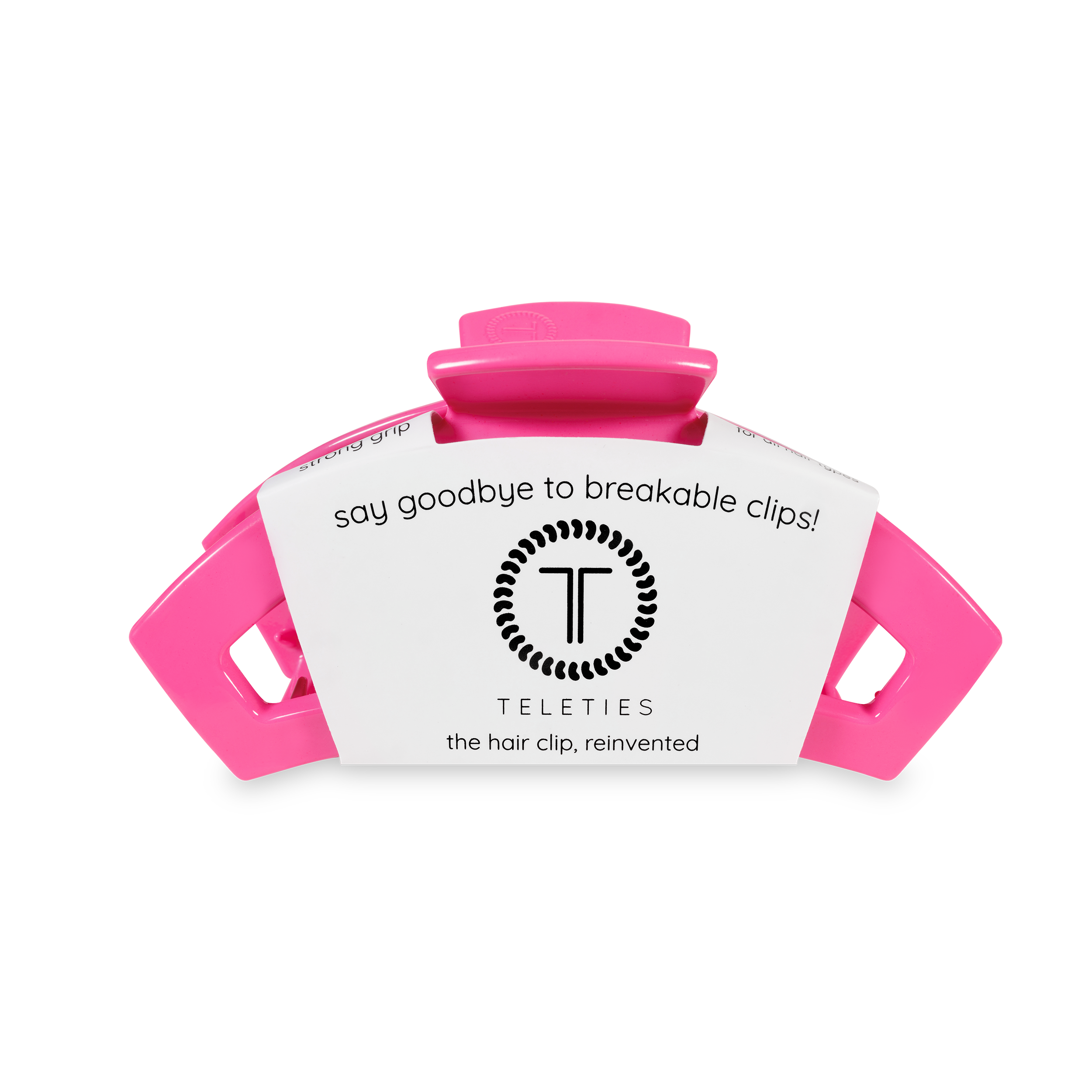 Open Hair Clip offers the same incredible advantages as our Classic Claw Clip, but with a unique open-style design that allows your hair to show through. Say goodbye to breakable clips! Perfected the hair tie and now have re-invented the hair clip. Each clip has bendable teeth that take back to shape, they work on all hair types and have a strong hold. Hold your hair and enhance your style with the new TELETIES Clip! Medium clips are great for thick to medium thickness of hair. Large clips are great for thick hair.