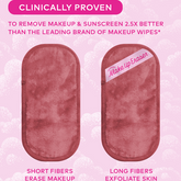 Erase all makeup with JUST WATER™ including waterproof. Patented, water-activated, cloud-soft fibers gently & easily remove all makeup & sunscreen from pores. 2 in 1 benefit: one side erases makeup & one side exfoliates skin.