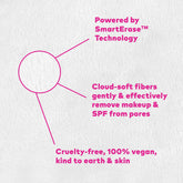 Erase all makeup with JUST WATER™ including waterproof. Patented, water-activated, cloud-soft fibers gently & easily remove all makeup & sunscreen from pores. 2 in 1 benefit: one side erases makeup & one side exfoliates skin.
