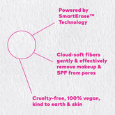 Erase all makeup with JUST WATER™ including waterproof. Patented, water-activated, cloud-soft fibers gently & easily remove all makeup & sunscreen from pores. 2 in 1 benefit: one side erases makeup & one side exfoliates skin.