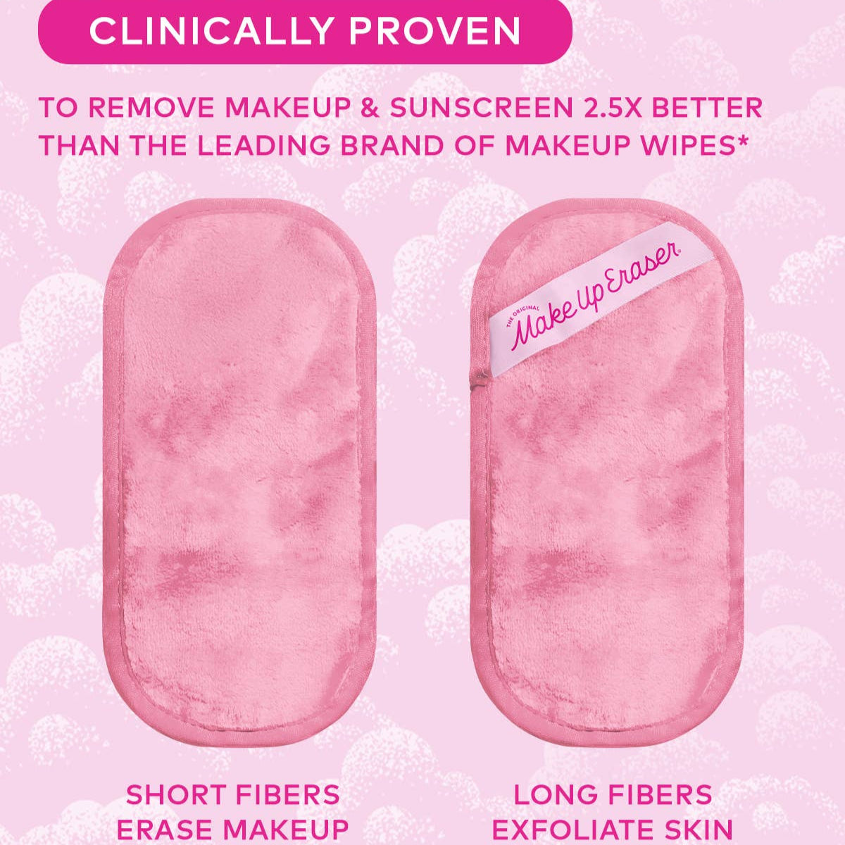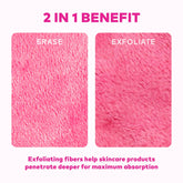 Erase all makeup with JUST WATER™ including waterproof. Patented, water-activated, cloud-soft fibers gently & easily remove all makeup & sunscreen from pores. 2 in 1 benefit: one side erases makeup & one side exfoliates skin.