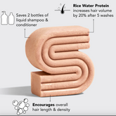 Shampoo Bar formulated with rice water to help repair damaged hair follicles & prevent split ends. Rice Protein has been shown to increase hair volume by 20% after 5 washes.* Gives you a nourishing cleanse to encourage overall hair length & density. Boosts shine in dull, dry hair. Safe for Color-treated hair Reduces single-use plastic: saves two bottles of liquid shampoo/conditioner.