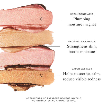 Caprylic/Capric Triglyceride, Octyldodecanol, Mica, Simmondsia Chinensis (Jojoba) Seed Oil, Silica, Beeswax (Cera Alba), Helianthus Annuus (Sunflower) Seed Wax, Flavor/Aroma, Octyldodecyl Myristate, Capparis Spinosa Fruit Extract, Ethylhexyl Palmitate, Dimethylmethoxy Chromanol, Trihydroxystearin, Sodium Hyaluronate, Titanium Dioxide (Ci 77891), Iron Oxides (Ci 77491)