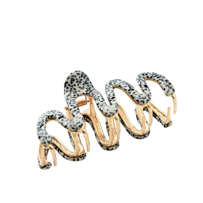 The Willow Core Large clip showcases an elegant squiggle pattern. This 4-inch metal claw clip is ideal for medium to long hair, combining a sturdy metal base with a refined cellulose overlay.
